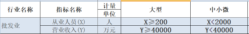 工信部联企业[2011]300号批发业标准是,从业人员200人以下或营业收入40000万元以下的为中小微型企业。其中,从业人员20人及以上,且营业收入5000万元及以上的为中型企业;从业人员5人及以上,且营业收入1000万元及以上的为小型企业;从业人员5人以下或营 业收入1000万元以下的为微型企业。 第一步、人数25人,营业收入19000万,均未满足大型企业标准,所以肯定属于中小微企业。