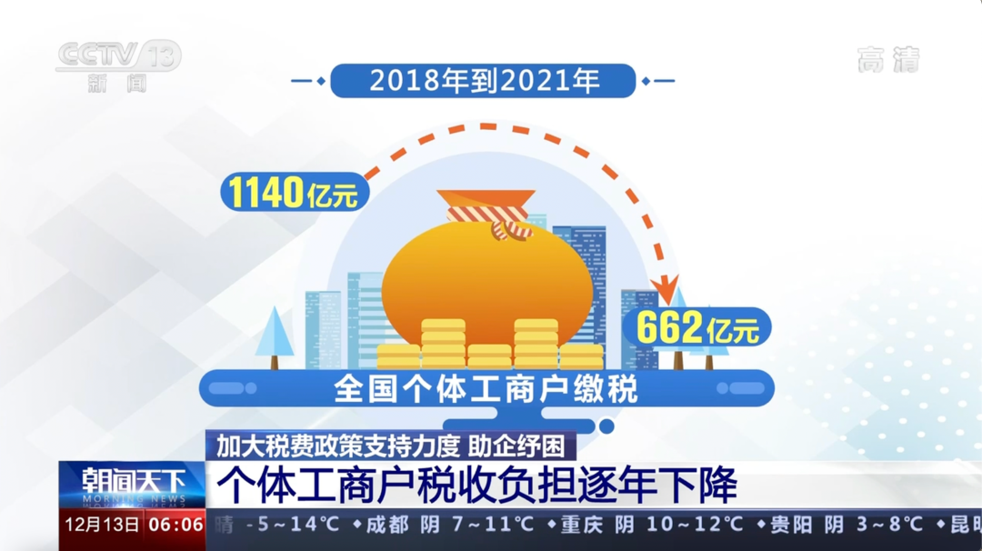 2018年到2021年,全国个体工商户缴税从1140亿元降至662亿元,今年1至10月累计缴税519亿元,全年预计缴税580亿元左右,相比2018年下降了一半。
