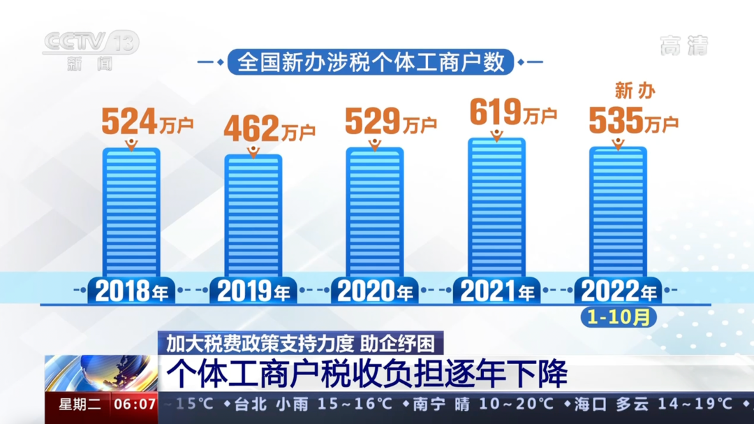 截至今年10月底,全国涉税个体工商户数为3862万户,比2018年末净增加851万户。新办涉税个体工商户数量在增加,而随着减税降费力度不断加大,缴税规模却在不断减少,税收负担明显减轻。