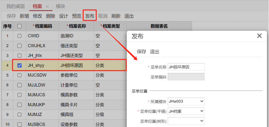 对“损坏原因”档案进行“分类”管理,并在自定义档案的“设计”中对其增加一个“损坏界定标准”的文本字段,然后发布: