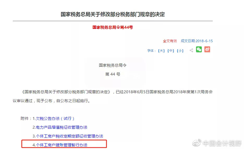 2018年6月15日公布的《国家税务总局关于修改部分税务部门规章的决定》(国家税务总局令第44号)附件4《个体工商户建账管理暂行办法》对个体工商户建账提出了明确要求: