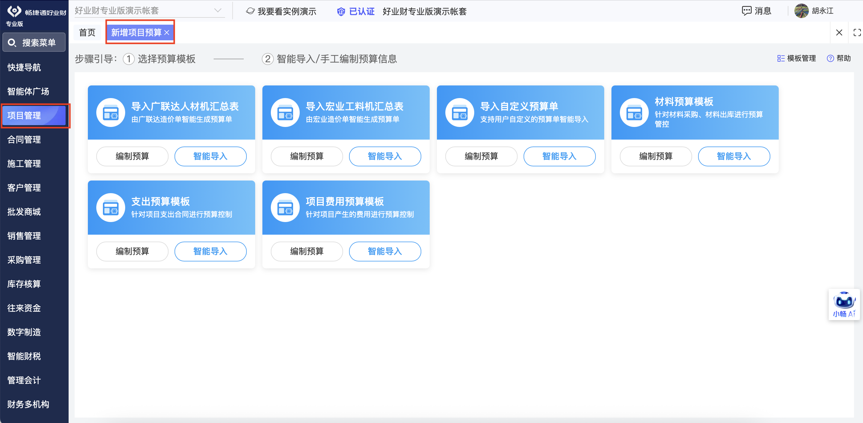 事前预算编制:项目立项后,合约成本部在好业财【项目预算单】中,按项目、按阶段录入材料的预算数量。如果使用广联达等预算软件,还可以直接将预算清单导入系统,极大提高效率。